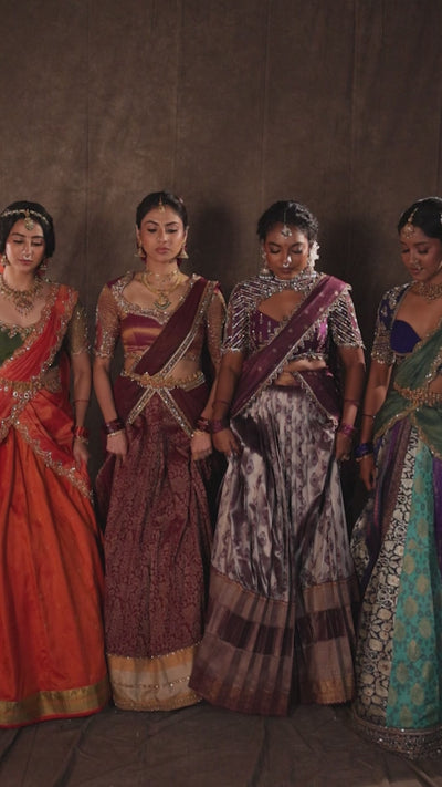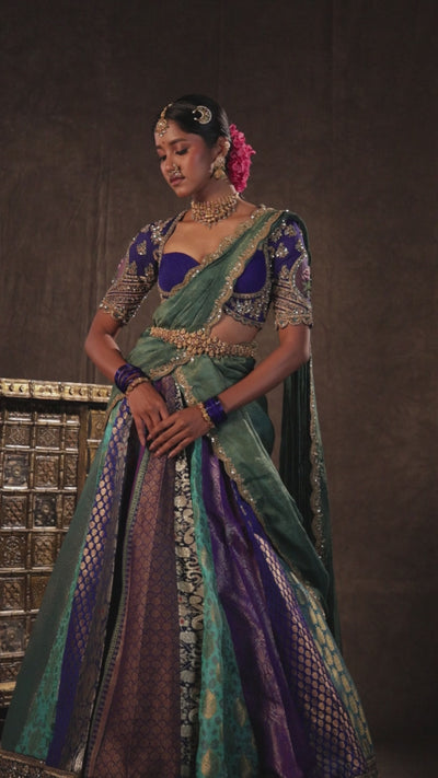 This limited edition half saree set in shades of purple, comprises of a silk blouse yoke, dupatta and banaras silk skirt. Intricately handcrafted with zardozi, stones, resham, cutdana, sequins and metal coin hangings. It is paired with a scalloped veil.