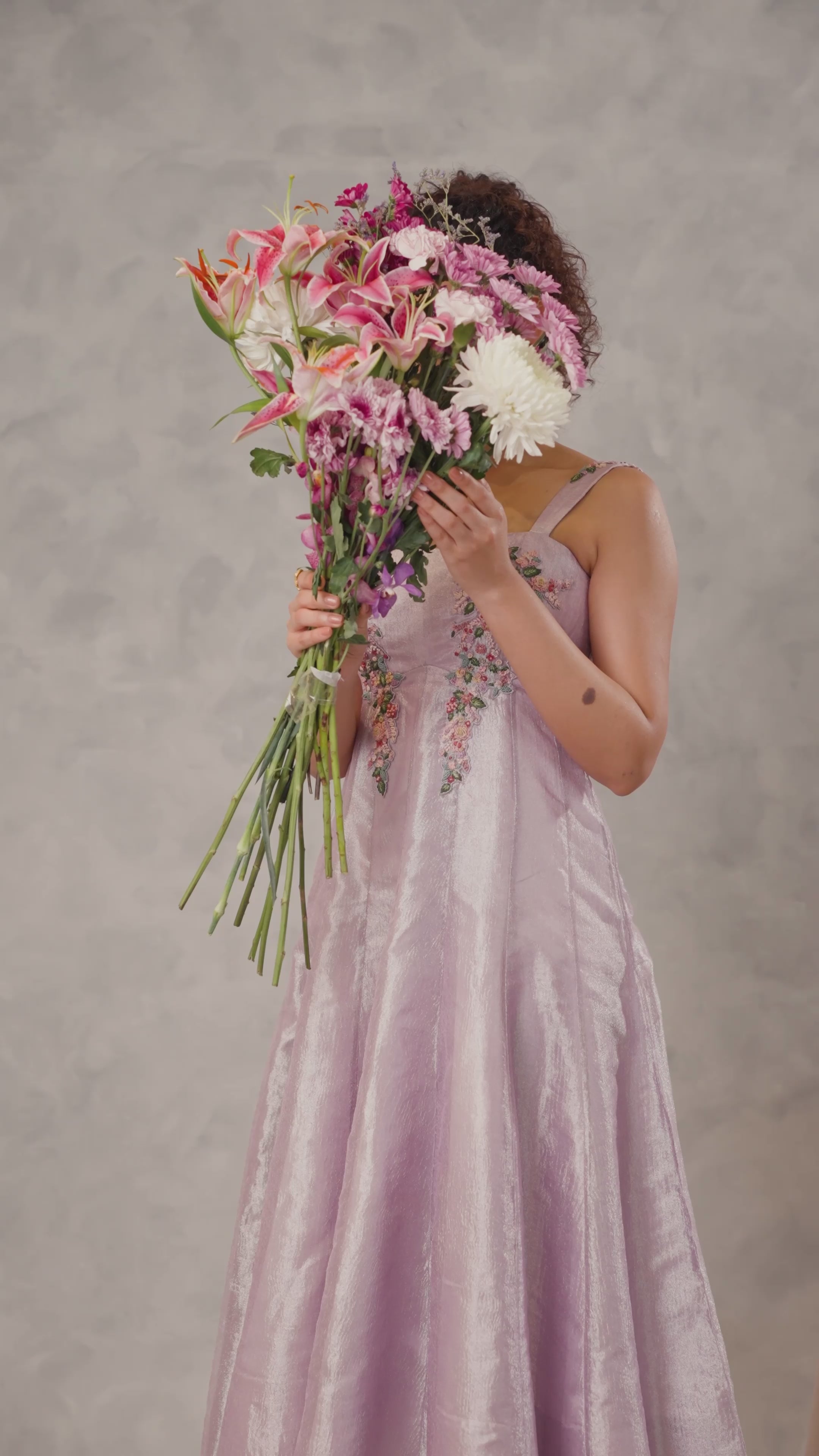 Elegance in every detail. This exclusively curated stunning lavender crushed tissue dress features a beautifully structured corset body adorned with intricate embroidery.